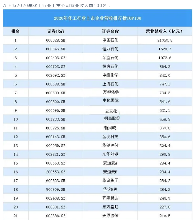 化工企業(yè)收入百強(qiáng) | 中國石化、恒力石化、榮盛石化破千億元!